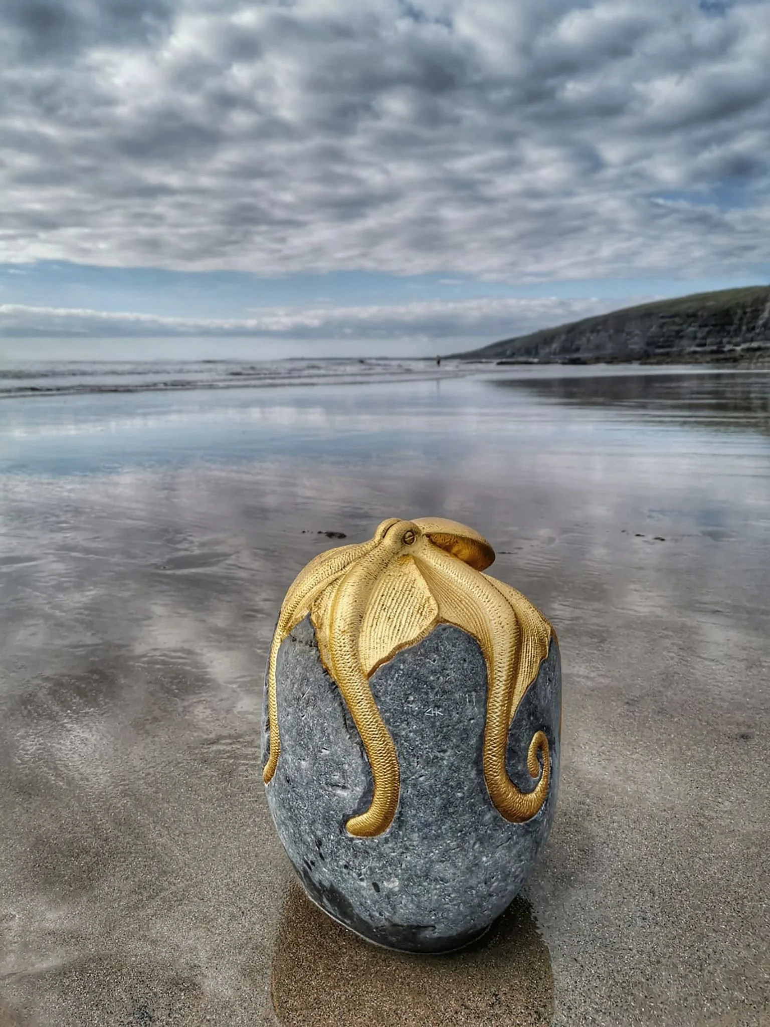 Where the Sea meets the Sky is ethereal and sometimes elusive. The patterns in our glass artworks are generally abstract and the natural colour palette features colours drawn from the earth and the sky. The carvings are influenced entirely by the coastline with some being simply carved into stone and other materials, others are adorned with gilded finishes using a variety of precious metal leaves.